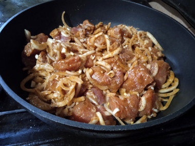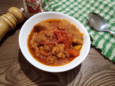Понравился мне этот рецепт и я решила попробовать приготовить чашушули по грузински из говядины, заменив мясо на свинину. Сначала я нарезала лук и мясо по описанию в рецепте. Замариновала в острой аджике, масле и лимонном соке. Хорошо руками помяла мясо с луком. Для рецепта использовала целые помидоры без кожуры в собственном соку. Болгарский перец у меня замороженный и порезанный кубиками был. Замаринованное мясо обжарила. Перец чили не клала из-за очень острой аджики. Затем тушила мясо с помидорами в собственном соку до мягкости свинины. Затем добавила болгарский перец, измельчённый чеснок и хмели-сунели. В конце я совершенно забыла добавить зелень, вылетело из головы просто. Блюдо так ароматно пахло, что хотелось по-быстрее попробовать. Это потрясающе вкусно, сытно и ароматно. Мясо получилось нежное и сочное. Подливка из томатов, перца и специй просто восхитительна. Подавала чашушули с домашней лапшой. Это невероятно вкусное грузинское блюдо. Всем советую попробовать! Рецепт прекрасный! Огромное спасибо автору 😀