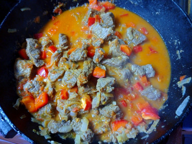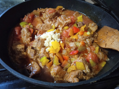 По истечении указанного времени положите к мясу помидоры, перец Чили, болгарский перец и тщательно всё перемешайте. Накройте сковороду крышкой и тушите мясо на медленном огне примерно на 1-1,5 часа, периодически помешивая. Точное время зависит от того, какая часть говядины используется и насколько мясо молодое). Если мясо ещё жёсткое, а жидкости в сковороде не осталось, то можно добавить томатный сок, либо перетёртые томаты.