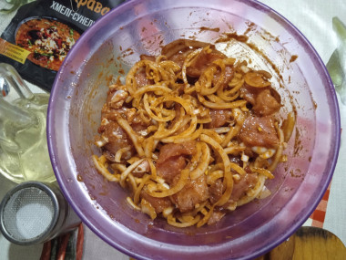К мясу положите нарезанный лук, влейте растительное масло, лимонный сок и добавьте аджику.