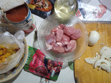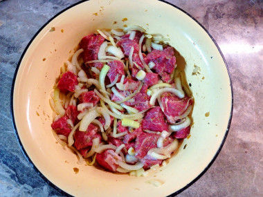 Мясо промойте, обсушите и нарежьте на некрупные кусочки, по возможности вырезав из мякоти жилы, жир и убрав плёнку. Положите нарезанное мясо в глубокую ёмкость. Репчатый лук помойте, очистите и нарежьте полукольцами. Чтобы лук при нарезке не щипал глаза, обмойте его и нож холодной водой.