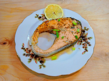 Обжаривала я горбушу по 5 минут, а иногда чуть больше, с каждой стороны, поскольку некоторые стейки были толщиной больше, чем 3 см.