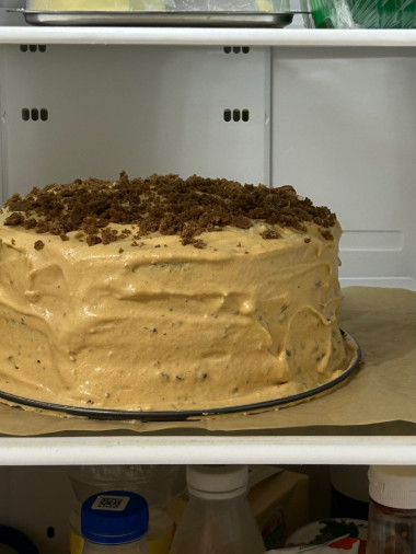Отложенный корж измельчите и обсыпьте торт по бокам.