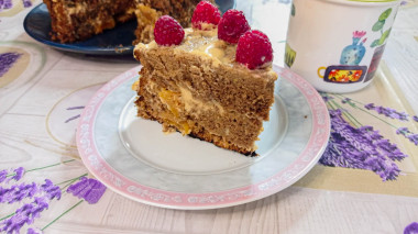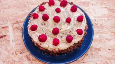Торт получился очень вкусный, хорошо пропитанный. Крем отлично сочетается с бисквитом. Украсила торт ягодами малины.
