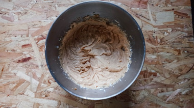 Для приготовления крема смешайте мягкое сливочное масло с вареной сгущенкой. Затем вмешайте в крем творожный сыр. Для этого можно воспользоваться миксером. Будет казаться, что крем жидковат. Это нормально. В собранном торте все хорошо застынет. Отложите 1/3 крема для обмазки торта.