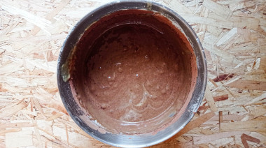 Затем вмешайте какао. Дно разъемной формы для выпечки застелите кулинарной бумагой и оденьте кольцо. Перелейте тесто в форму (20 см) и поставьте в духовку, предварительно разогретую до 180 градусов, на 45-60 минут. Ориентируйтесь по своей духовке. Готовый бисквит остудите, затем оберните пищевой пленкой и уберите в холодильник на ночь, чтобы он отлежался.