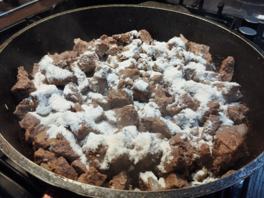 Мясо с луком посыпьте мукой, посолите, поперчите и тщательно перемешайте. Жарьте еще около 3 минут.