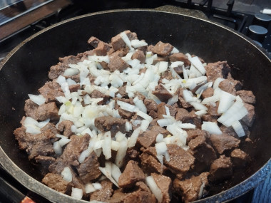 Выложите в сковороду к мясу нарезанный лук. Жарьте вместе, помешивая, около 5 минут на среднем огне.