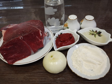 Как сделать гуляш из говядины с подливкой классический на сковороде? Подготовьте ингредиенты. Для гуляша из говядины с подливкой нам понадобится: мякоть говядины, луковица, томатная паста или томатный соус (по желанию), вода, мука, лавровый лист, черный молотый перец, соль.