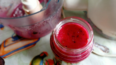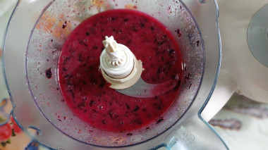Ягоды с сахаром я перетерла в кухонном комбайне. Из 300 граммов смородины и 300 граммов сахара у меня получилась одна небольшая баночка (350 мл) смородины перетëртой.