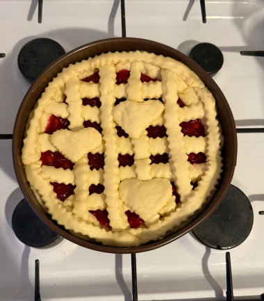 , всё приходит с опытом. Верх пирога смазала смесью яйца и сметаны. Выпекала в своей духовке при 180 градусах 20 минут. Пирог вышел изумительно вкусным! Тесто нежное и мягкое! Повидло нигде не убежало. Я и моя семья в восторге! Обязательно буду печь такие пироги ещё, экспериментировать с начинками и украшениями