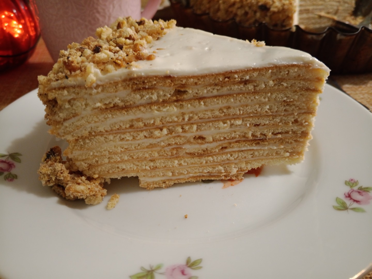 После приготовления поставила в холодильник, через 3-4 часа мы его попробовали—нереально вкусно было, ничего лишнего, все гармонично. Остатки торта ели уже на следующий день, он ночь постоял, ещё лучше прописался, вкусы поженились, он стал ещё лучше: повлажнее, посочнее, в общем, чем дольше стоит—тем лучше, даже показалось, что появился медовый привкус, хотя меда там и нет.
