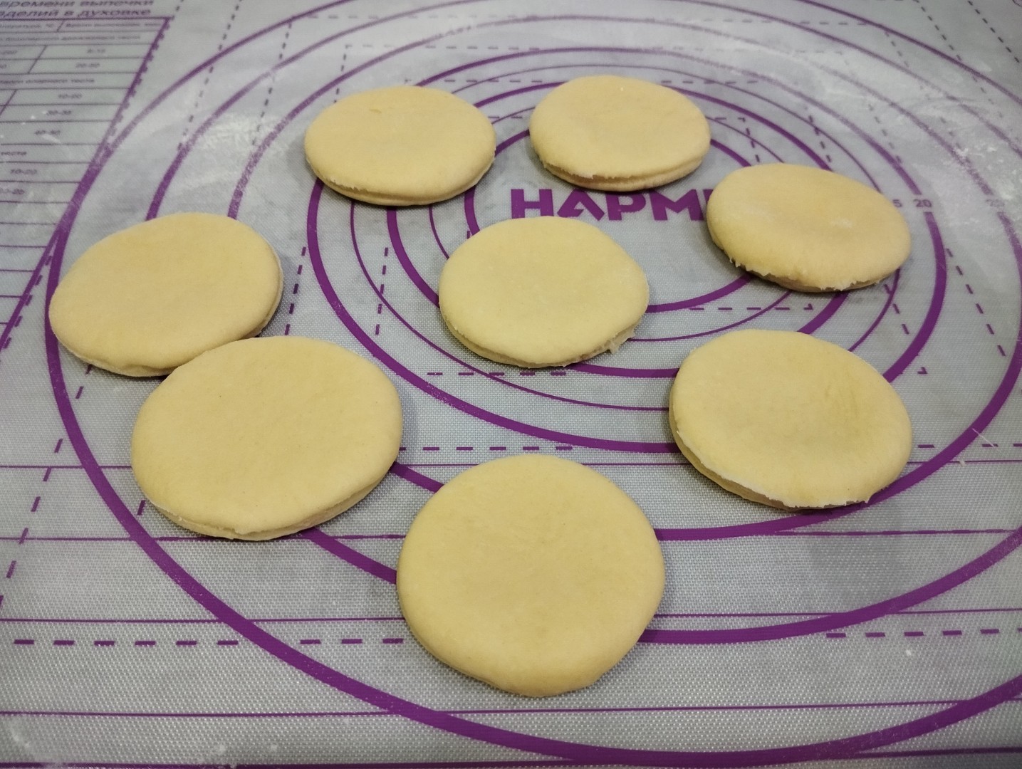 Тесто замесила за пару минут, очень быстро все. У меня в тесто ушло ровно 2 стакана муки+ сколько-то на раскатку, но тесто после замеса было мягким, хорошо раскатывалось. Разделила на 10 частей, тонко раскатала, выпекала на горячей блинной сковороде, на это уходило по 1-2 минуте на каждую сторону, после выкладывала на доску и вырезала по форме, чтобы коржи были ровными.