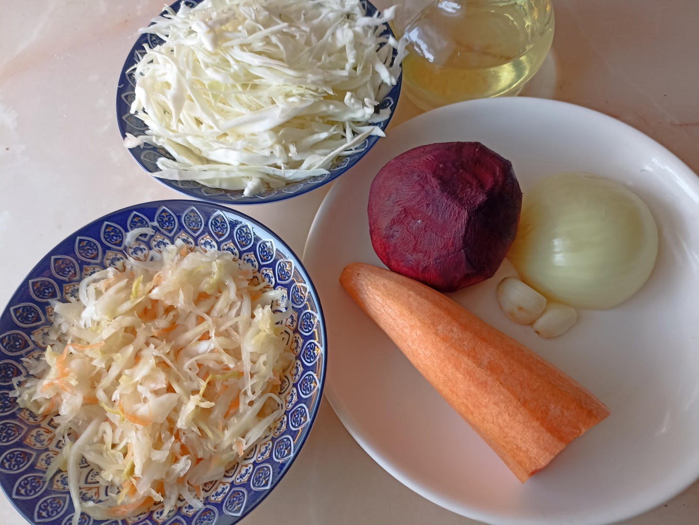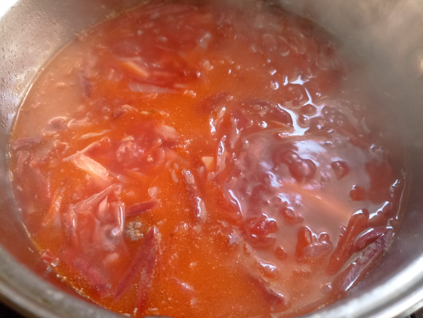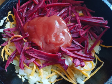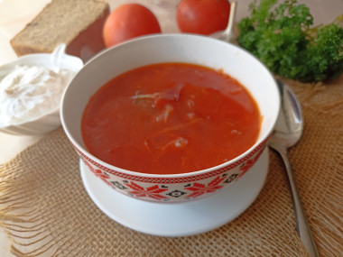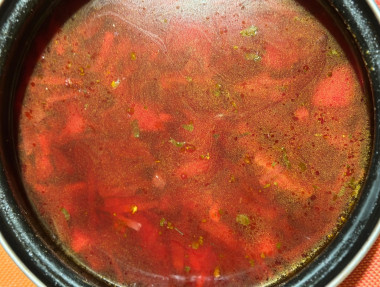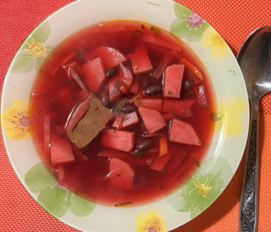 Самое любимое первое в моей семье. Очень домашний рецепт, который по достоинству оценивают хозяйки. Из говядины у меня была грудинка, я ее всю обрезала от прожилок, пленок и жира, чтобы бульон был не слишком жирным. Свеклу я варю заранее, потом ее обжариваю вместе с морковью и луком, добавляю томатной пасты. Капусту использовала только свежую, собственной квашенной нет, поэтому не рискую, чтобы не забрать цвет у борща. Добавила консервированную фасоль. За пару минут до окончания приготовления я добавила буквально 0,2 ч.л. уксусной эссенции и зелень. С уксусной эссенцией рекомендую действовать очень аккуратно, если переборщить, то будет ну просто кисло. Всем желаю вкусных блюд, автору отдельное спасибо за такой красочный рецепт!