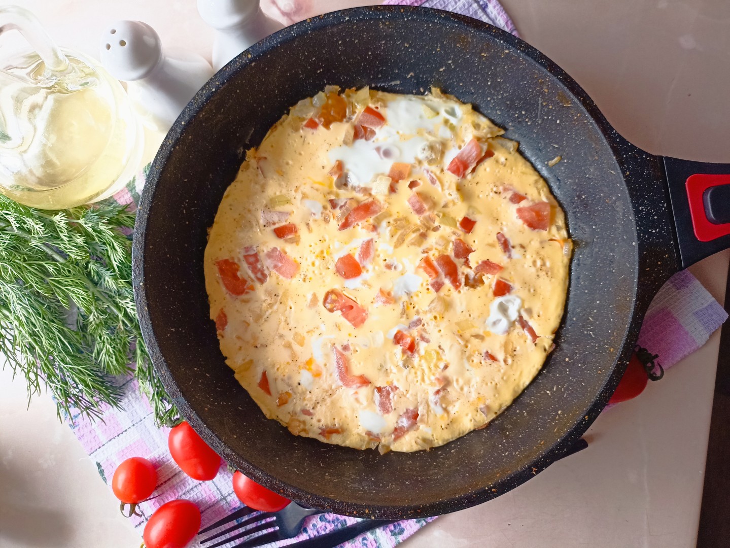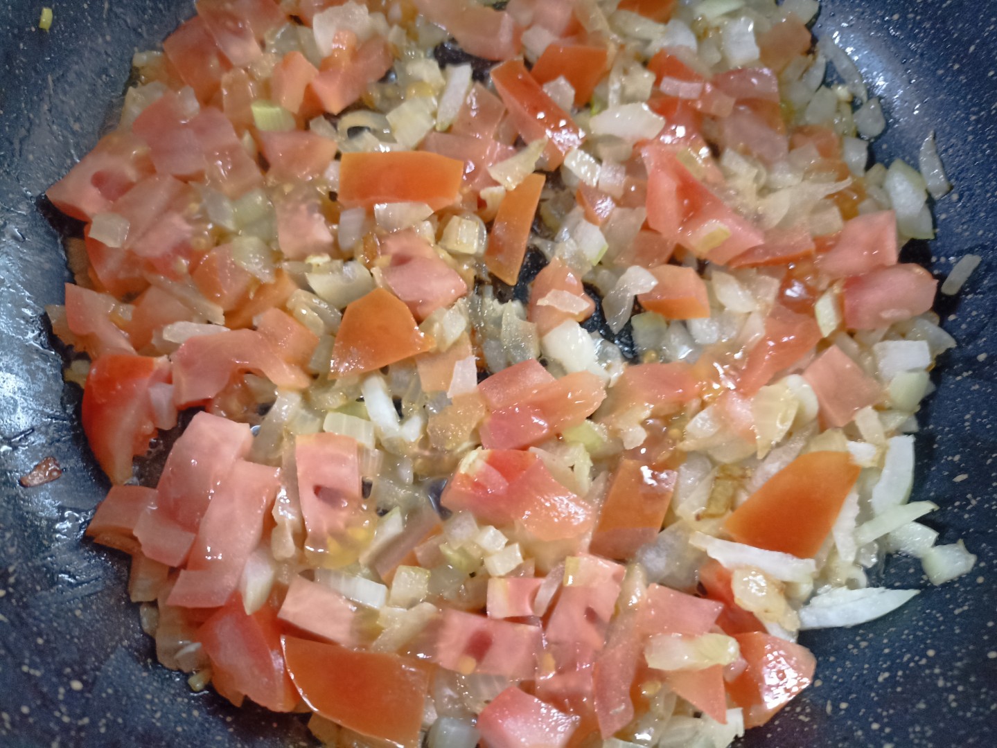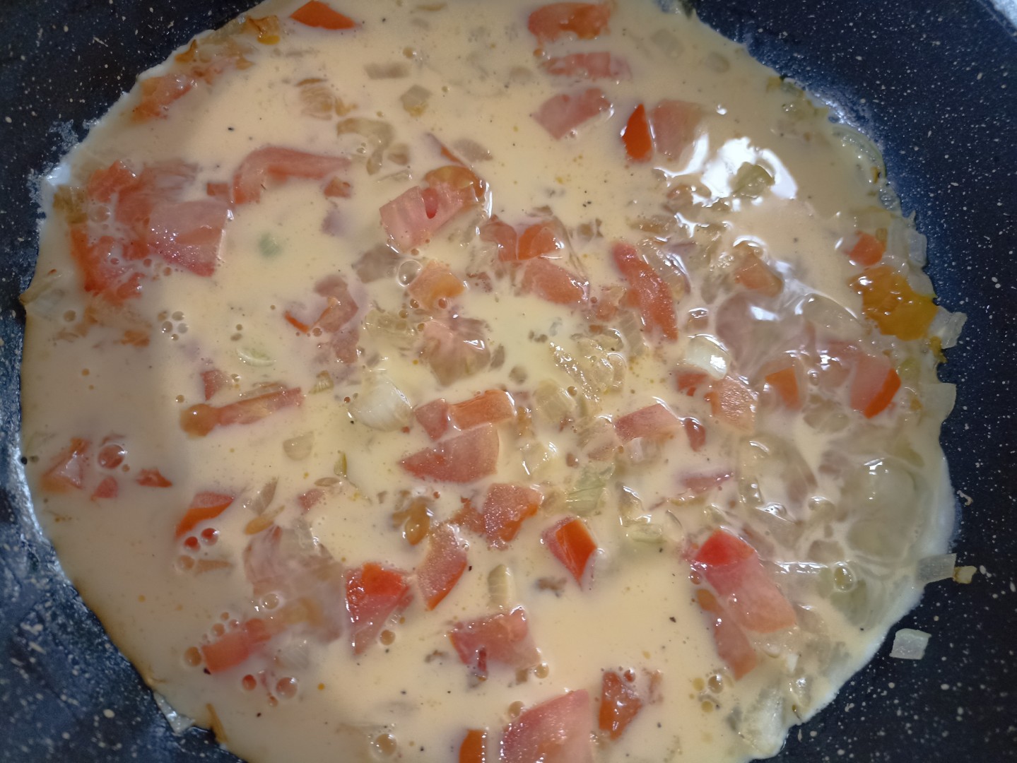 На завтрак приготовила омлет лук помидоры на сковороде. Нарезала мелким кубиком репчатый лук, обжарила его на сковороде, добавила кубики свежего помидора, ещё пару минут обжарки и залила к овощам яично-молочную смесь. Сразу закрыла сковороду с омлетом крышкой и оставила на медленном огне до готовности. Несколько лишних минут на приготовление по сравнению с простым омлетом, зато в результате получается очень вкусный, сочный, аппетитный и полезный завтрак! Спасибо автору за рецепт!