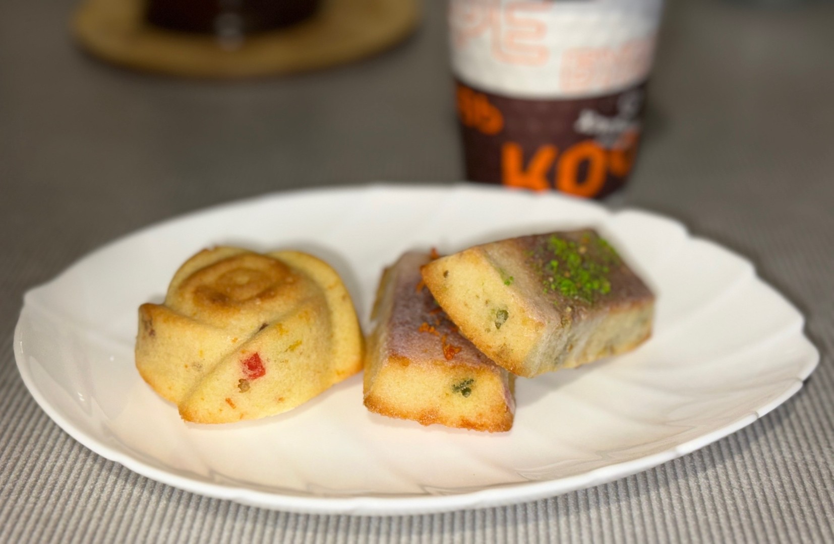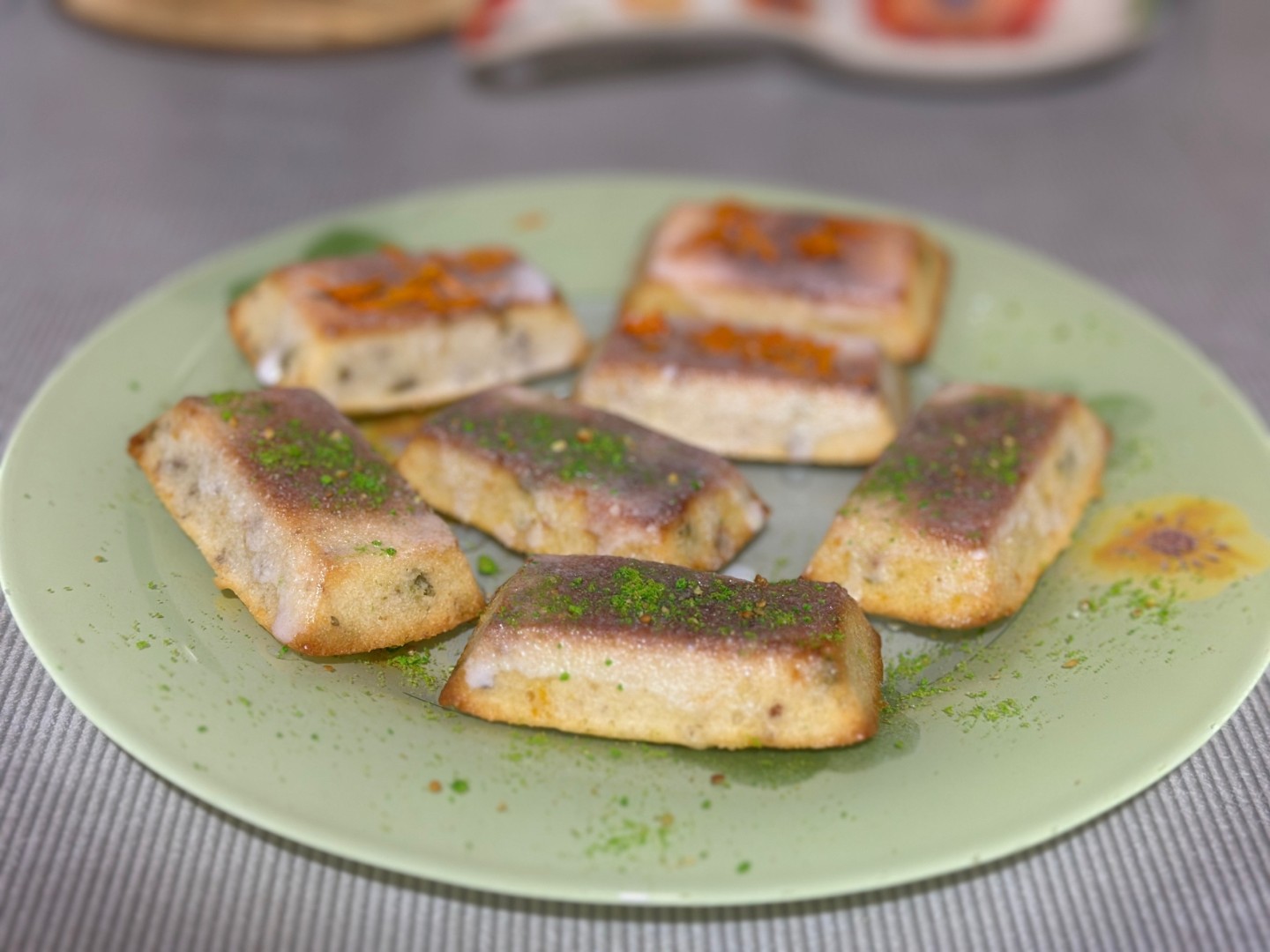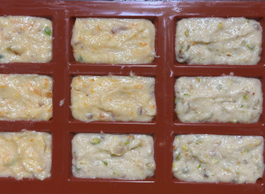 Пришлось вспомнить о скалке) орехи я положила на разделочную доску, накрыла пленкой и прошлась по ним скалкой. Получилось очень хорошо. Тесто также разделила на 2 части, аккуратно перемешала, добавила к цукатам свежую цедру. У меня форма на 9 кирпичиков, тесто осталось, поэтому распределила его по отдельным формочкам. Выпекала в газовой духовке без конвектора 30 минут. Сверху немного смазала глазурью, посыпала фисташковым топингом и цедрой. Как сказал муж (а он врать не будет