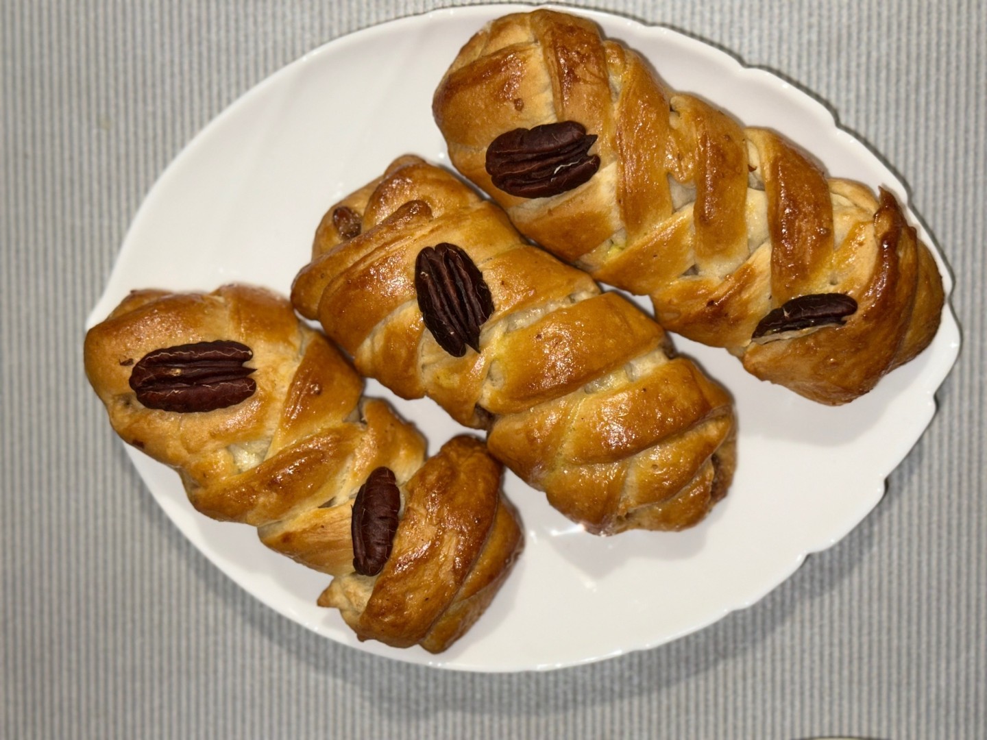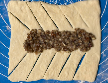 . Тесто использовала слоеное дрожжевое 200 гр. Получилось 3 небольшие слойки. Выложив начинку на тесто, заплела, как показала автор. Еще минут 10 заготовки полежали на противне, потом я их смазала сиропом. Минут через 20, когда слойки поднялись, я их вытащила из духовке и смазала все же желтком, поверх своего сиропа, потому что он глянец почему-то не дал. В газовой духовке без конвектора выпекались 35 минут. Результат -ну просто восторг, это именно тот случай, когда сочетание ингредиентов создаёт поистине незабываемый вкусовой букет