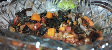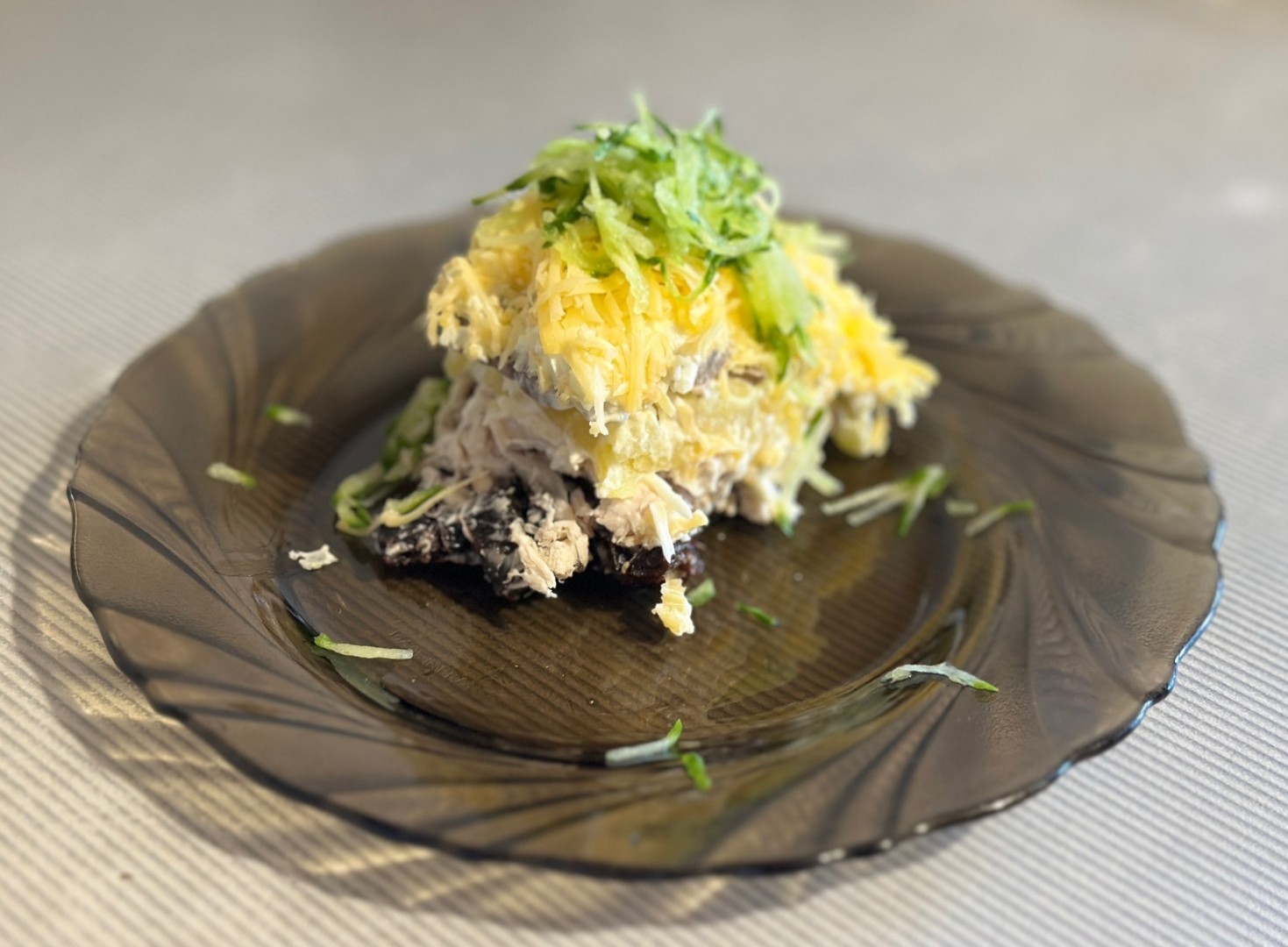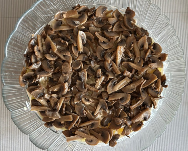 Отличный салат! Нежный вкус курицы гармонично сочетается и с черносливом и с грибами. Готовила не на праздничный стол, поэтому салат делала в одной салатнице. Выкладывала слои в последовательности автора. Яичный слой немного смазала майонезом. Огурец я натирала на мелкую терку, когда выкладывала в тарелку порционно. Я думала он пойдет больше для красоты, но на мой вкус он придал легкости этому салату. Для тех, кто будет готовить его также как в салатнице, советую потом накрыть пищевой пленкой, чтобы сыр не засох. Очень вкусно, сытно, спасибо автору