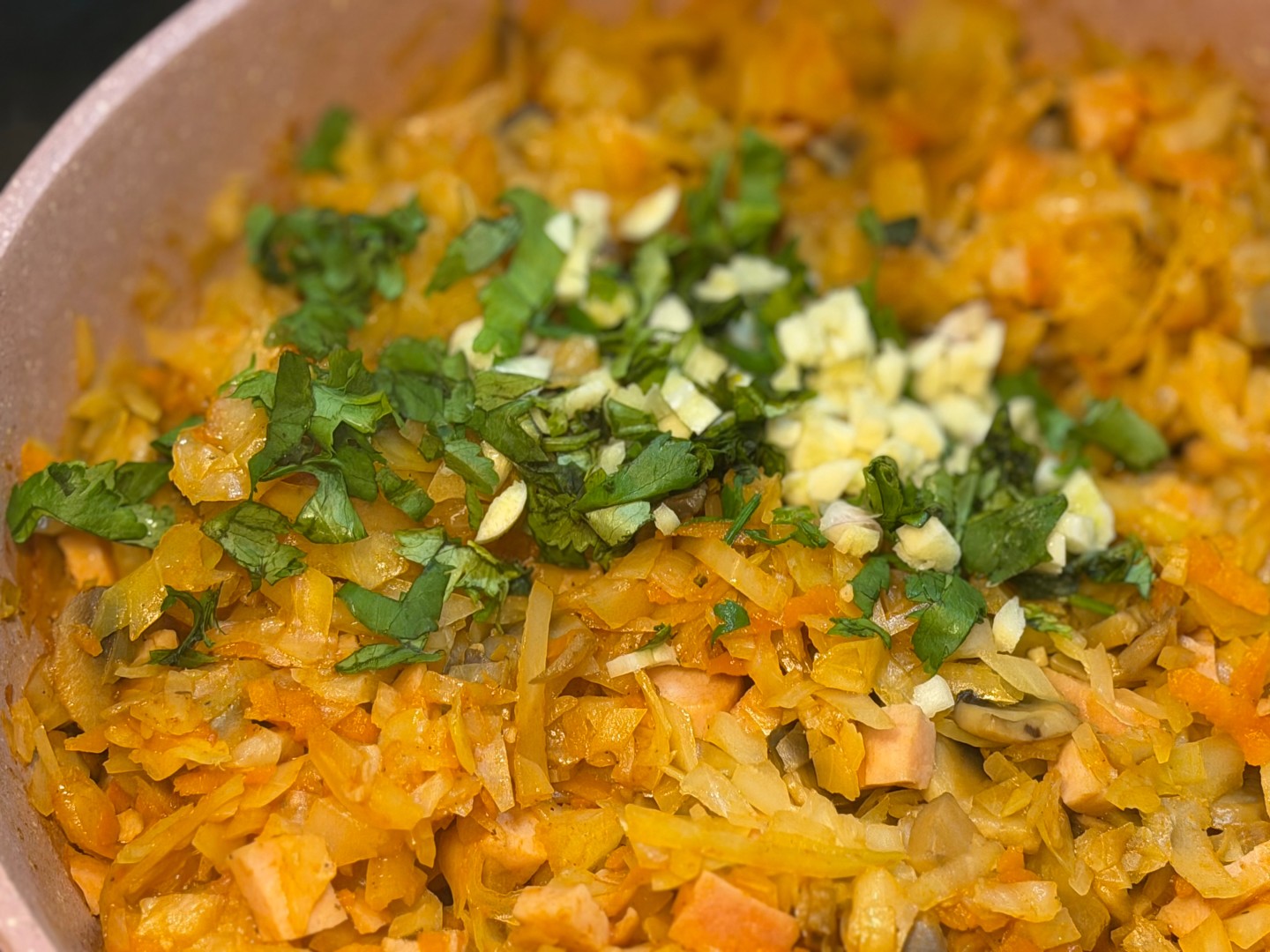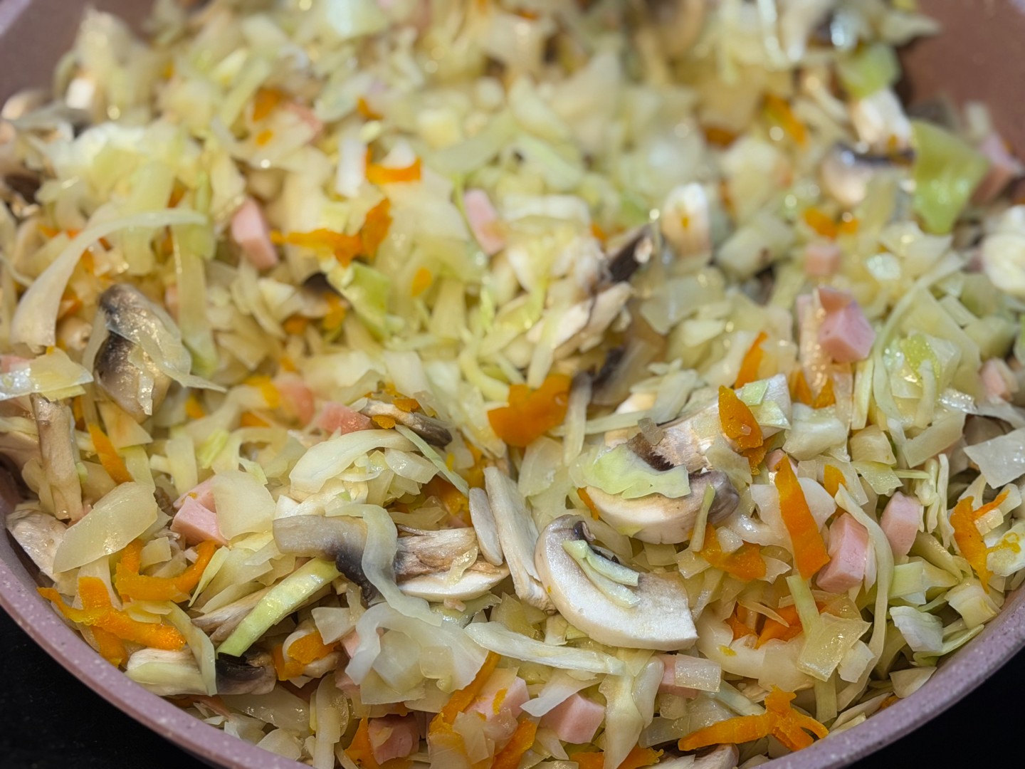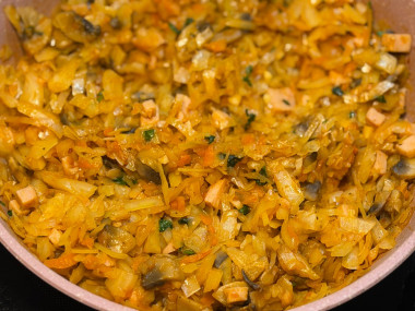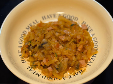 Когда покупаешь кочан капусты на одно небольшое блюдо и от него остается еще много, то в ход идет тушеная капуста 🤭 Я не стала обжаривать по отдельности грибы и лук-морковь, а обжарила их вместе, чтобы сэкономить время. А также использовала завалявшийся в холодильнике кусочек ветчины, который порезала кубиком и потушила вместе с овощами. На мой взгляд подкопченный вкус ветчины очень подошел к такому блюду. Затем добавила саму капусту, томатную пасту с водой и специями, а минут за 5 до конца приготовления добавила чеснок и зелень по вкусу. Получилось очень вкусное сочетание таких простых ингредиентов 🤤 спасибо 🌸🔥
