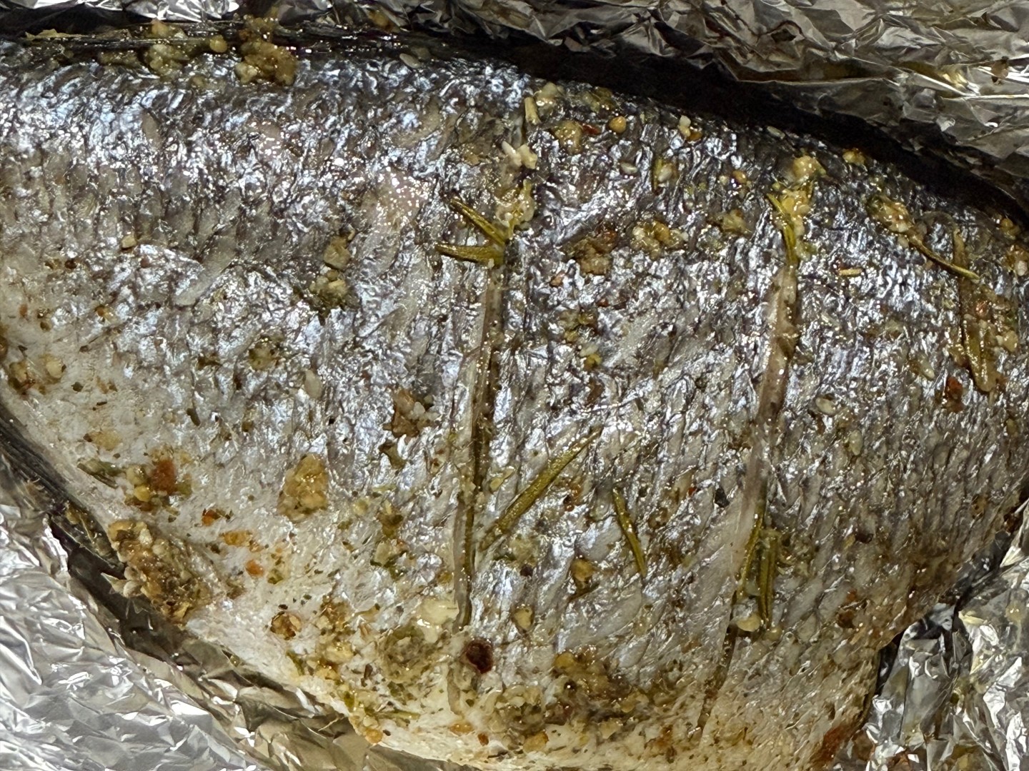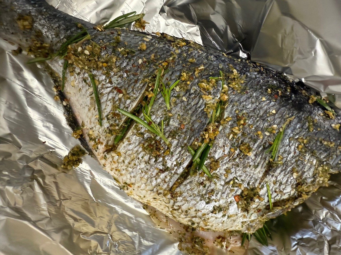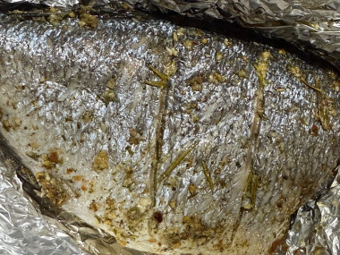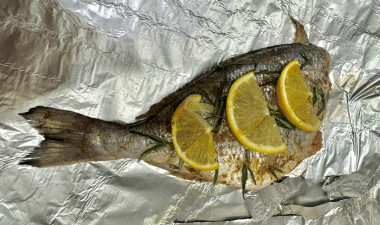 Не стала удалять жабры, а убрала сразу всю голову 🤭🤪 Не нашла в местном магазине перец чили и свежий тимьян, поэтому посыпала готовой приправой для рыбы, в составе которой как раз были эти ингредиенты. Розмарин взяла свежий - в сочетании с лимоном получился невероятный аромат 😍 Перед подачей лимон убрала. Спасибо за рецепт 🌸