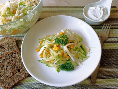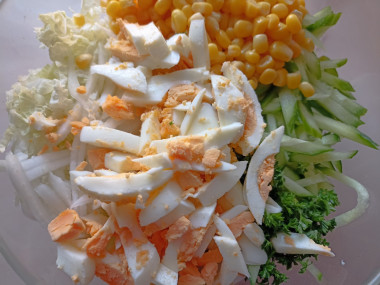 Захотелось лёгкого и быстрого перекуса, выбор пал на рецепт салата пекинская капуста кукуруза яйца. Всего несколько минут - и готово! Салат хрустящий, сочный, аппетитный. Удачное сочетание продуктов хорошо дополняется сметанной заправкой. Спасибо за рецепт, katushafin!