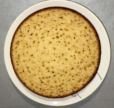). Форма у меня 18 см, смазала сливочным маслом и отправила в газовую духовку без конвектора на 45 минут. Горка у бисквита началась подниматься примерно минут через 20, ее никак не убрать, серединка пропекается дольше всего. Бисквит ну просто нежнейший, такой красивый, влажный и пористый. Вкус не приторно сладкий (верхний 4й слой съели пока собирала основу