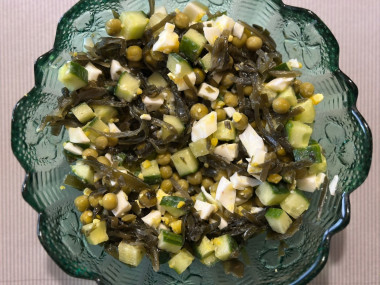 . Нашла этот вариант блюда за 20 минут до выхода на работу, поняв, что нужно что-то взять с собой поесть) Идеально подходит для тех, кто следит за питанием из-за своей небольшой калорийности. Я его ничем не заправляла, так как морская капуста покупная и уже содержит растительное мало, этого мне оказалось достаточно для его заправки. Вкусно, быстро, недорого, то что нужно!!!