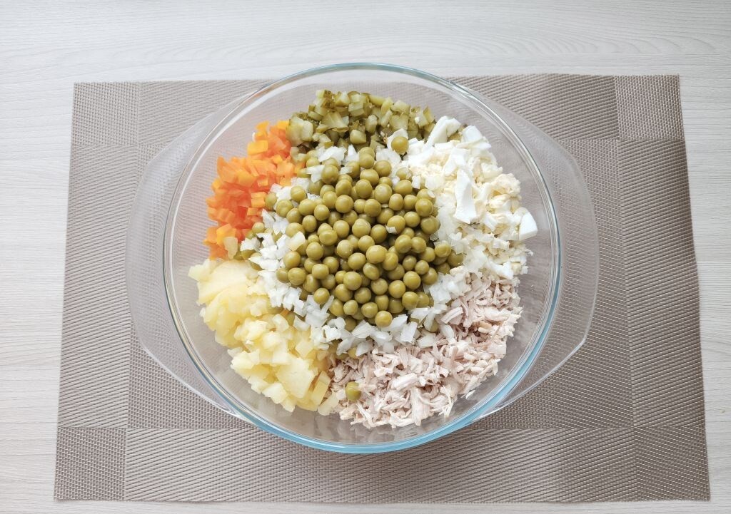 Заправляем салат качественным майонезом, добавляем перец и соль по вкусу. Тщательно перемешиваем и отправляем в холодильник на несколько часов, чтобы вкусы объединились. И вот он – оливье, жемчужина праздничного стола! Наслаждайтесь!