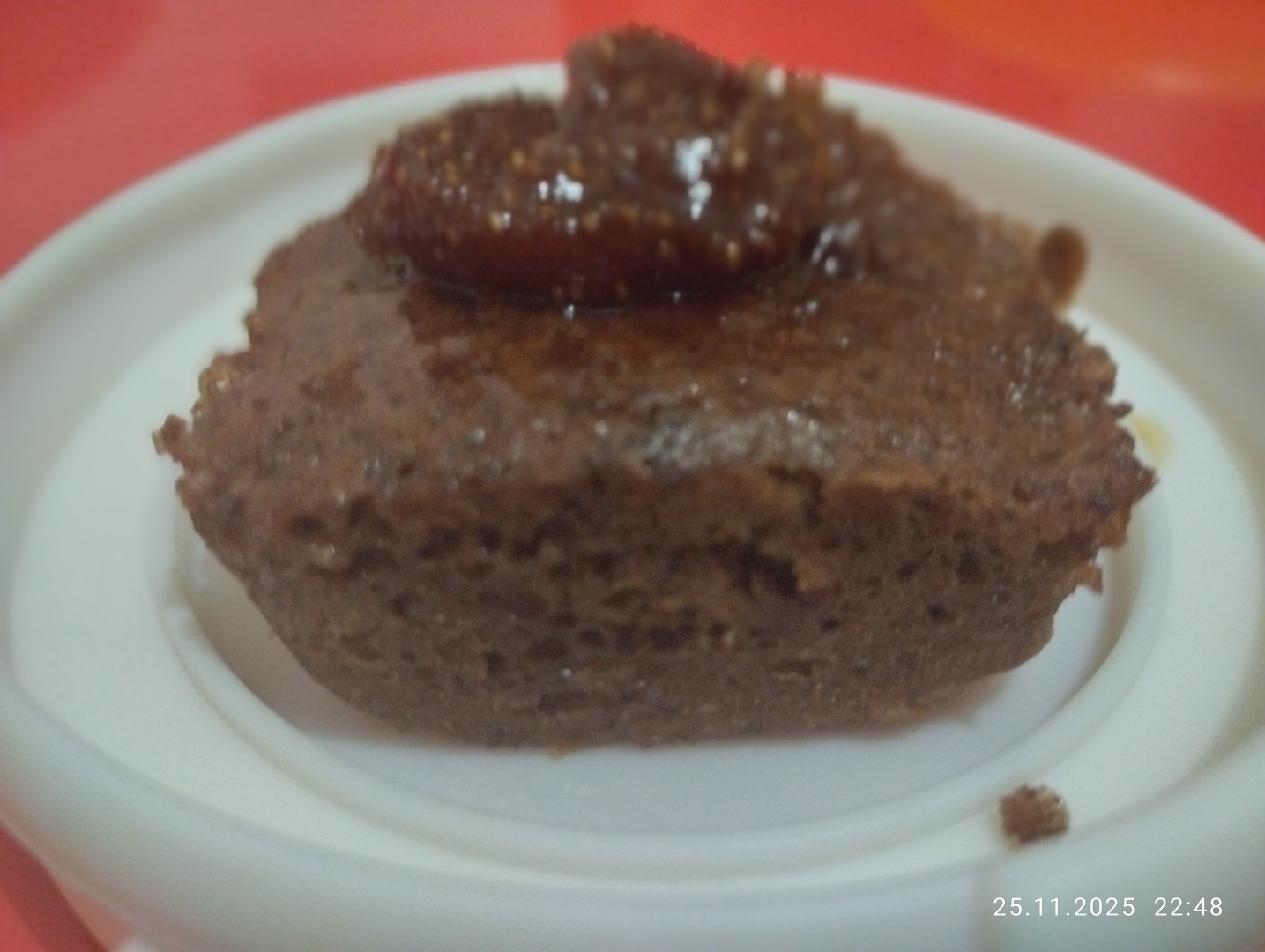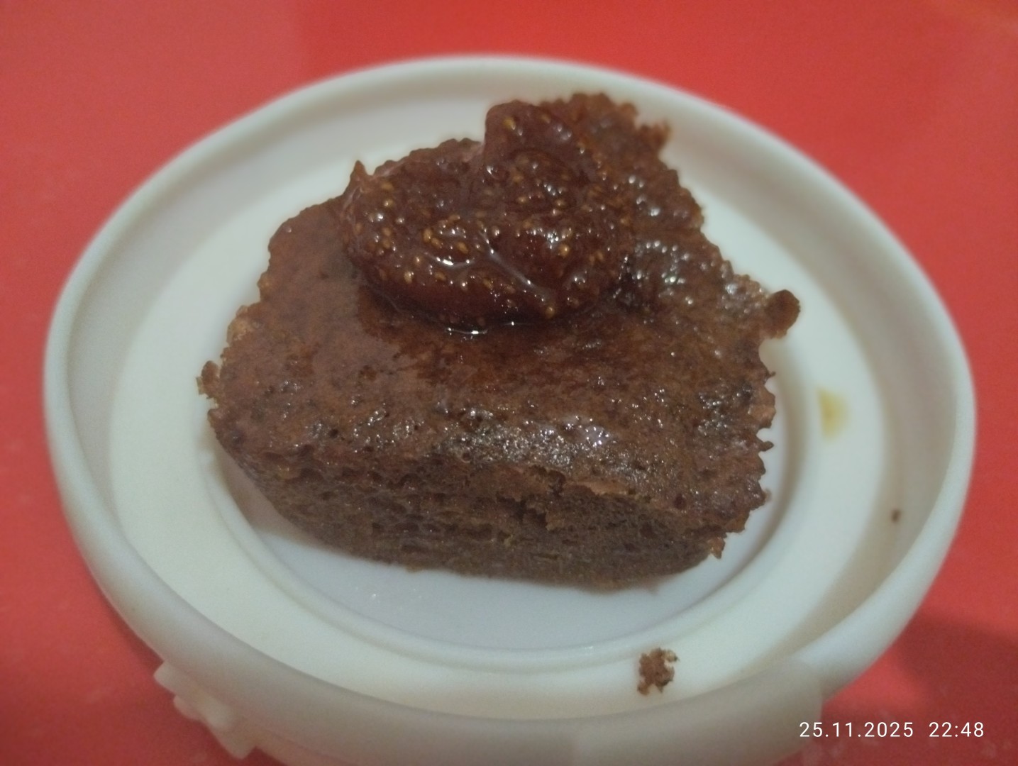 Получилось вкусно! Запах кекса чувствовался ещё до того как открыла микроволновку. Сверху так же добавила клубничное варенье в конце, без него суховато. Напоминает бисквит с какао, хоть и без яиц. К форме у меня ничего не прилипло, благодоря маслу как понимаю. Думаю что за такое короткое время - супер. Вместе с чаем "улетел" за минуту😂🙌 На фото только кусочек, его "урвала" для отзыва. Из-за формы ещё и новогоднего настроения добавилось😋