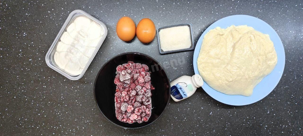 Вкусная ватрушка с творогом и малиной для вашего завтрака. Подготовьте все ингредиенты, яйца и творог должны быть комнатной температуры. Тесто у меня было подготовлено заранее. Малина замороженная. Творог берите большей жирности. Секреты приготовления выпечки с творогом вы можете посмотреть по ссылке в конце рецепта.