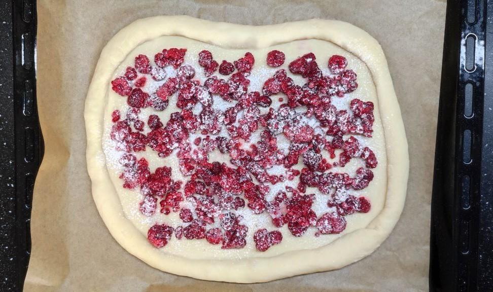 Поместите малину на тесто и присыпьте крахмалом, он впитает лишнюю влагу от ягод.