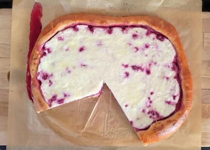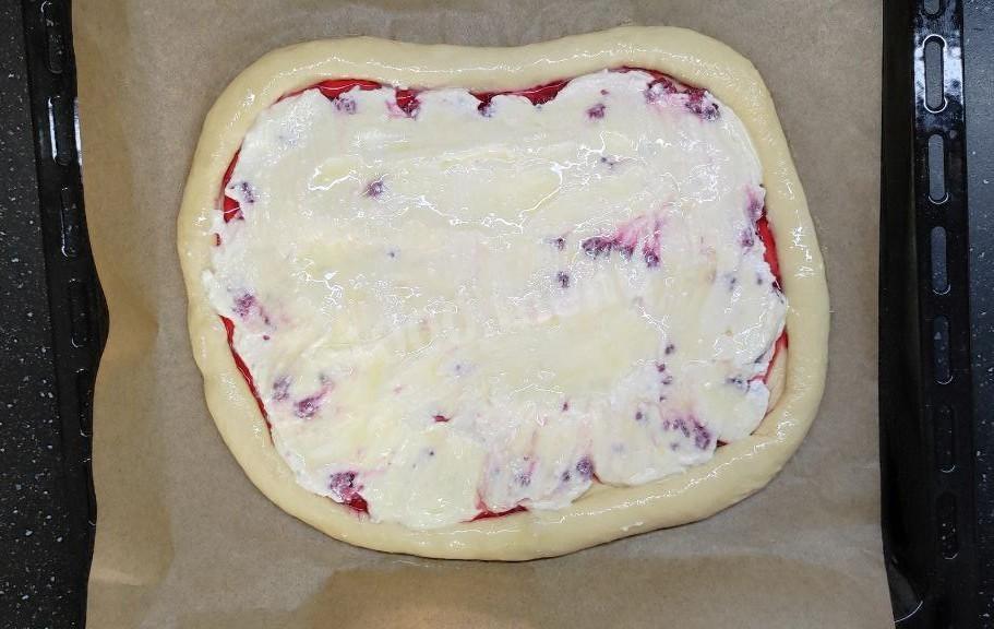 Залейте ягоды творожной смесь и равномерно распределите её по всей ватрушки. Смажьте края ватрушки и всю начинку взбитым яйцом с момощью кулинаркой кисти.