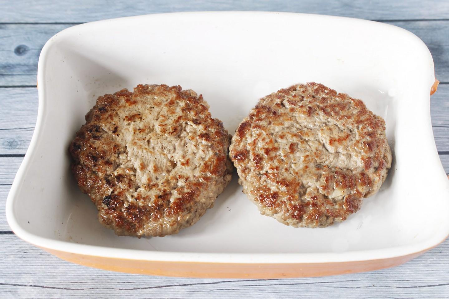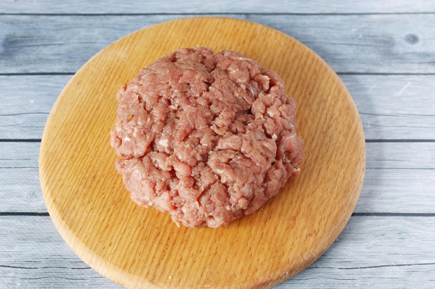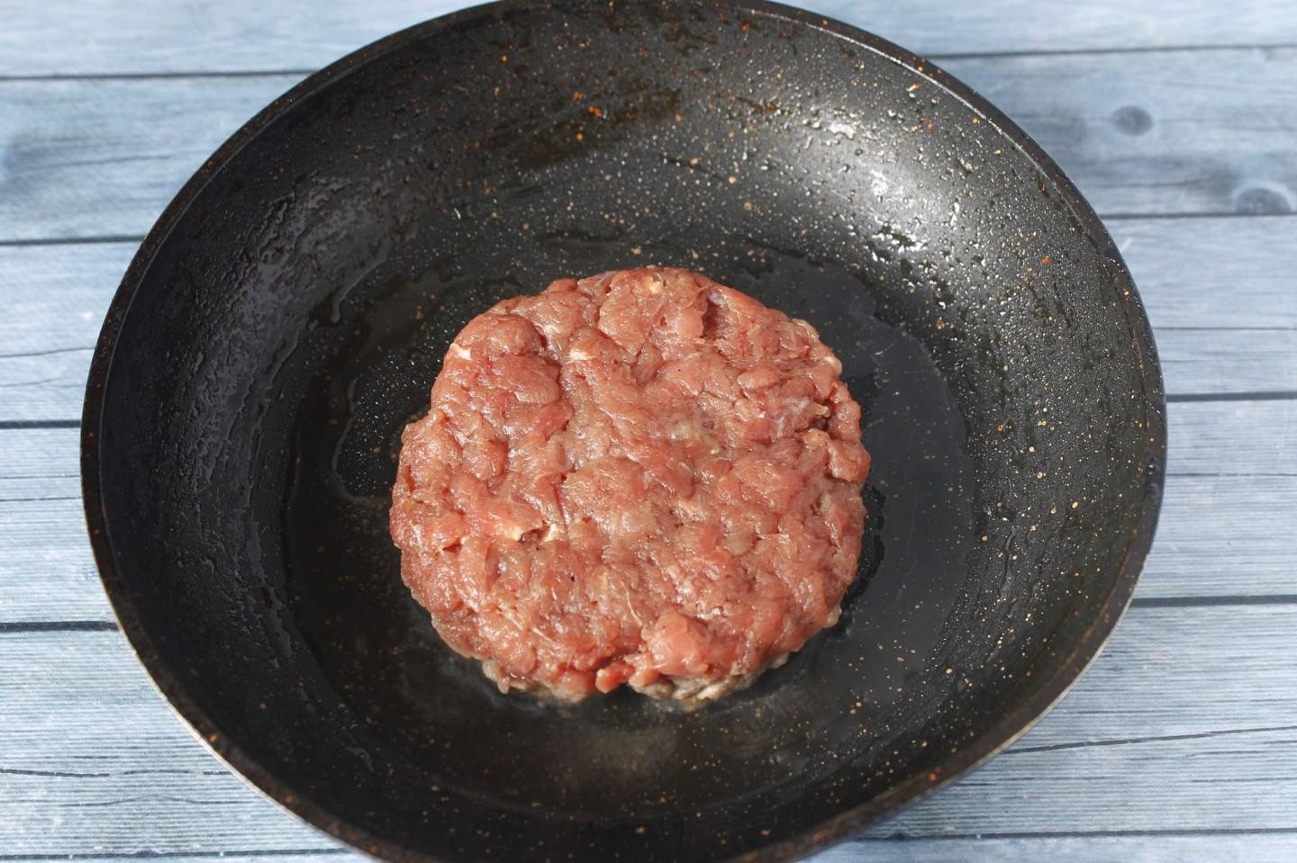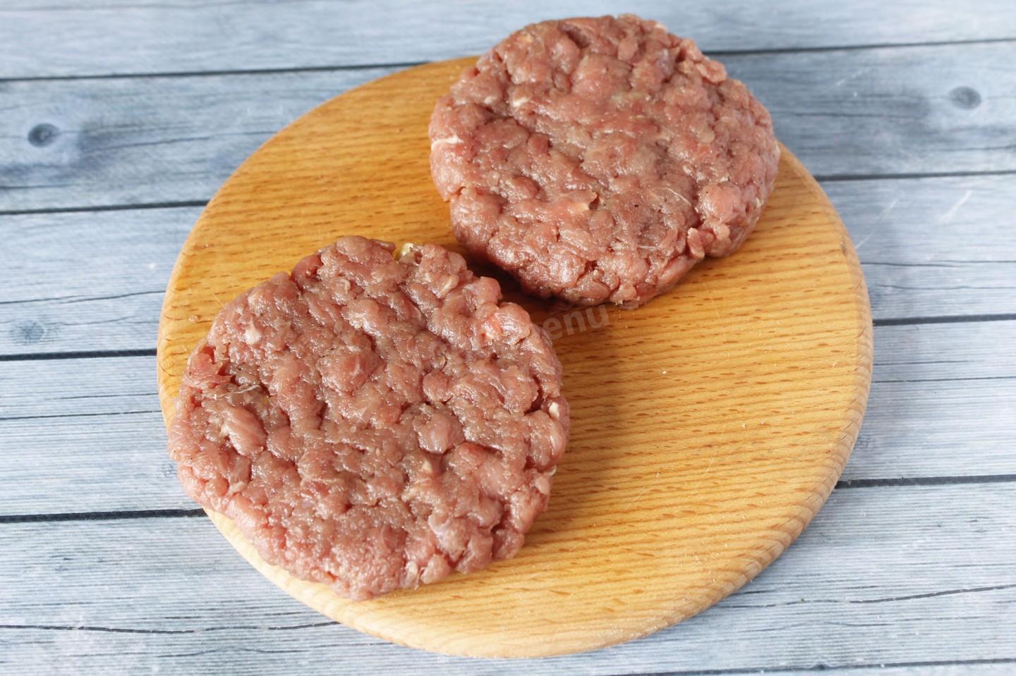 Смажьте руки растительным маслом и разделите фарш на две части. Возьмите одну часть фарша и несколько раз перекиньте ее из ладони в ладонь, чтобы еще больше сцепить фарш. Сформируйте круглую плоскую мясную лепешку. Также поступите и со второй частью фарша.