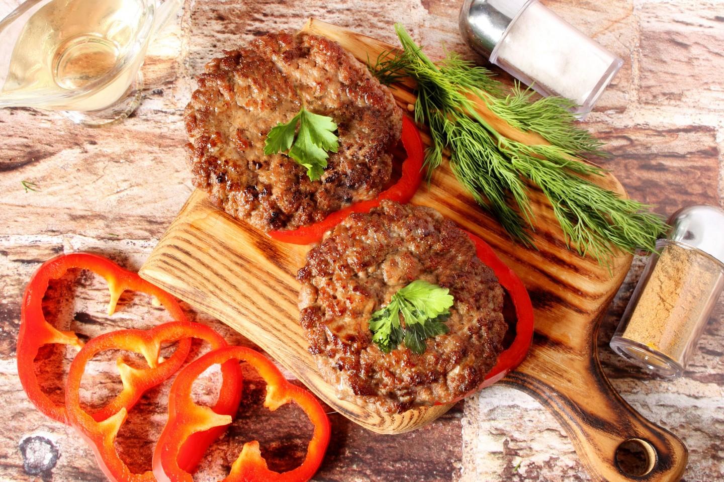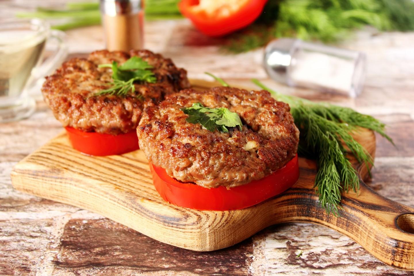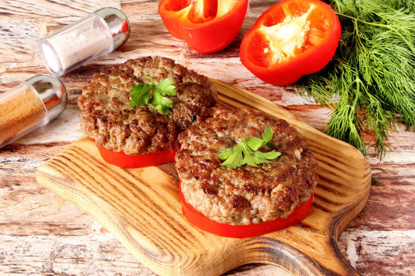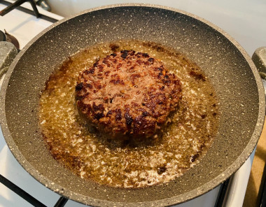 Смажьте руки растительным маслом и разделите фарш на две части. Возьмите одну часть фарша и несколько раз перекиньте ее из ладони в ладонь, чтобы еще больше сцепить фарш. Сформируйте круглую плоскую мясную лепешку. Также поступите и со второй частью фарша.