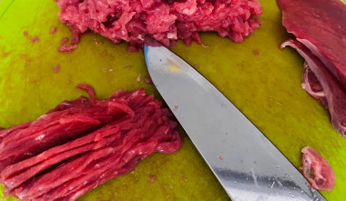 Как пожарить рубленный бифштекс из фарша свинины на сковороде? Подготовьте необходимые ингредиенты. Если мясо у вас замороженное, то предварительно разморозьте его. О всех тонкостях правильной разморозки читайте в отдельной статье, ссылка в конце рецепта. Мякоть говядины помойте и обсушите бумажными салфетками. Нарежьте мясо поперек волокон тонкой соломкой.