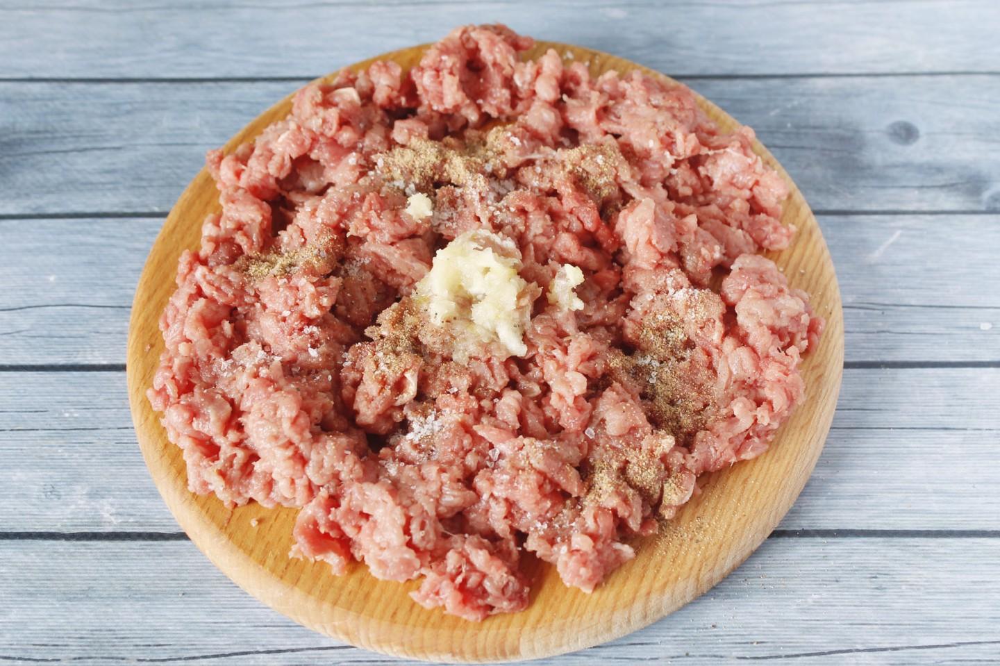 Очистите чеснок и пропустите его через пресс и отправьте к фаршу. Добавьте черный молотый перец и соль по вкусу. Я положила примерно 1 чайную ложку перца и 0,5 чайной ложки соли.