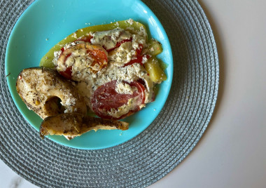 Овощную подушку через 20 минут запекания покрыла соусом и сверху выложила кусочки щуки. Запекала все вместе под фальгой 20 минут и затем 15 минут в открытом виде. Так овощи дойдут до готовности, а рыба не будет пересушена.