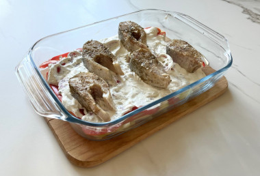 6. Смажьте сметанным соусом овощную подушку, выложите щучье филе, покройте сверху оставшимся сметанным соусом.