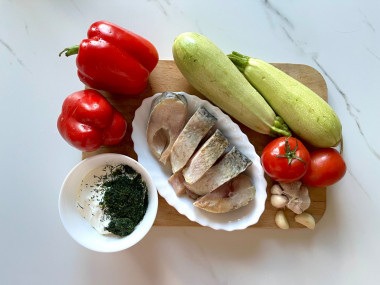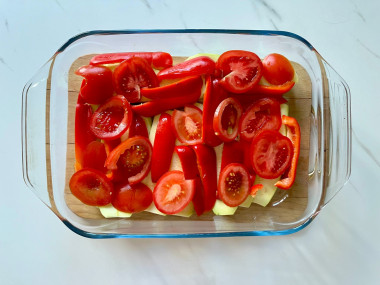Выложила слоями овощи: кабачок, помидор и красный болгарский перец (он добавляет сочности и яркость вкуса). Хочу отметить, что время запекания у овощей и рыбы разное. Поэтому сначала отправила одни овощи на 20 минут.