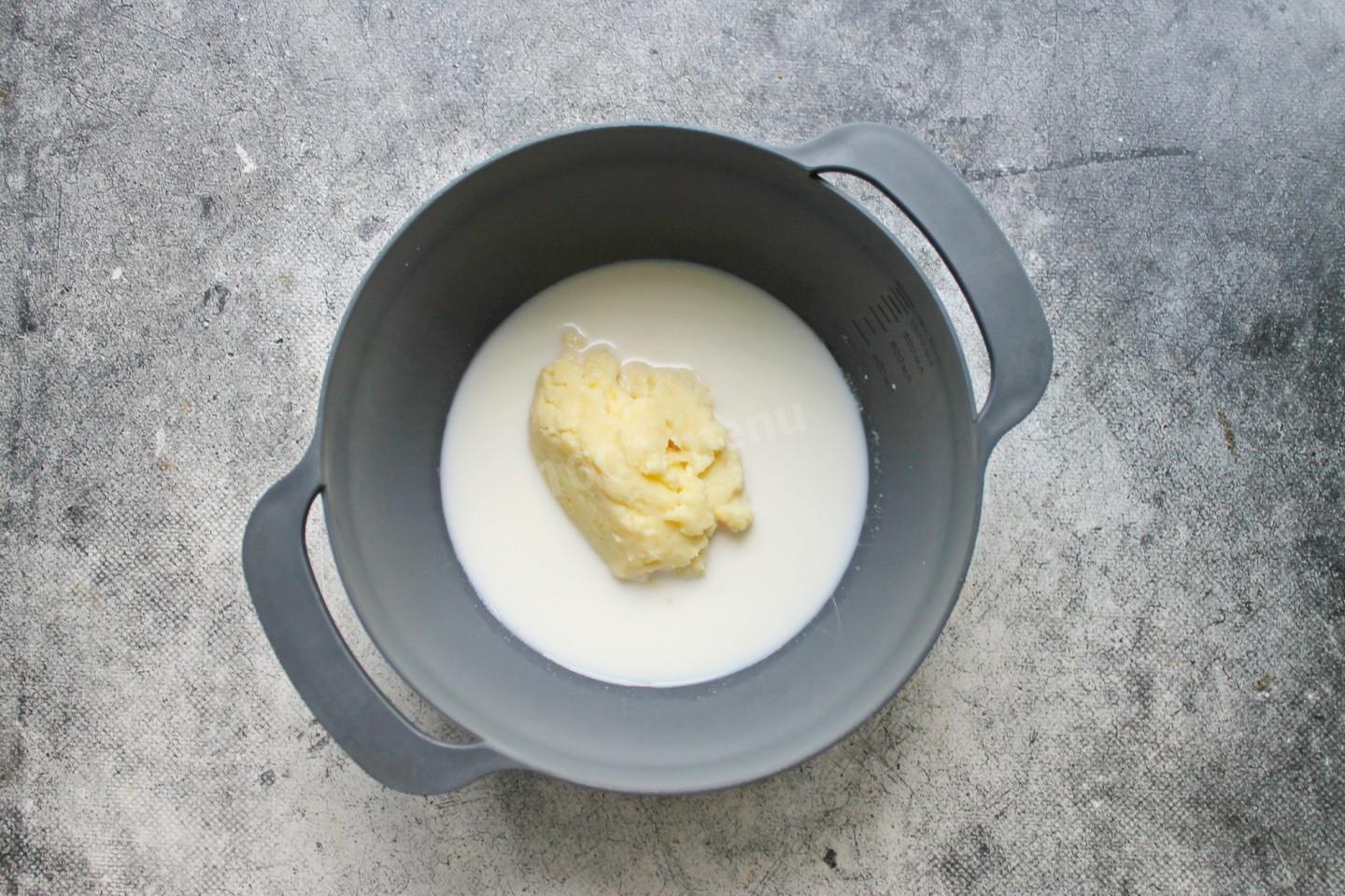 В миску положите картофельное пюре и влейте теплое молоко. Молоко можно взять любой жирности и заменить его на сливки. Все хорошо перемешайте венчиком до однородности.