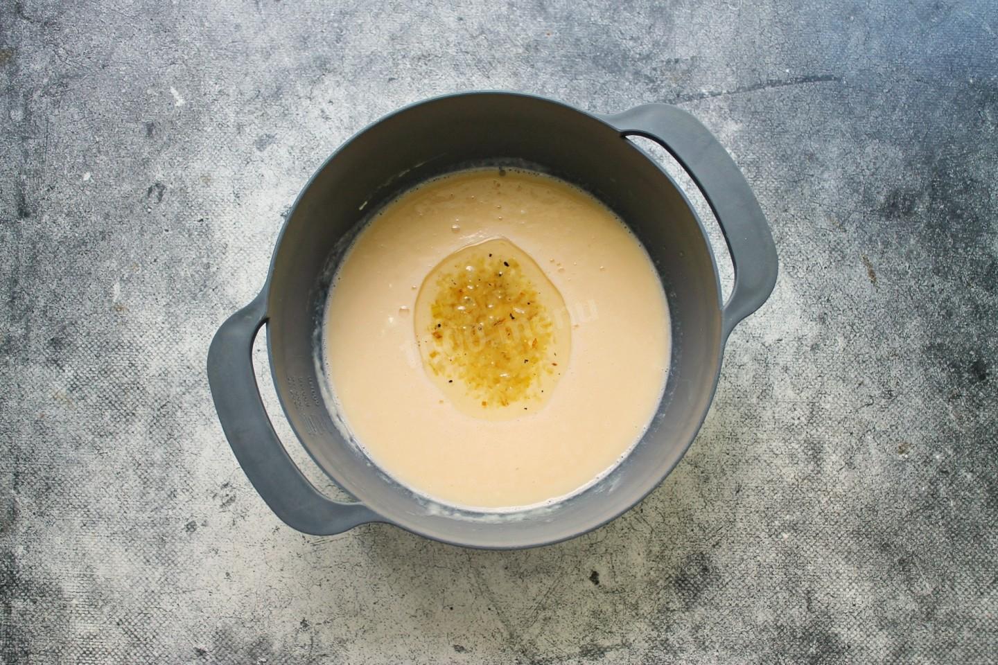 Добавьте сахар, соль и хорошо перемешайте венчиком до растворения кристаллов соли и сахара. Учтите, что картофельное пюре уже соленое, поэтому ее может понадобиться меньше.
