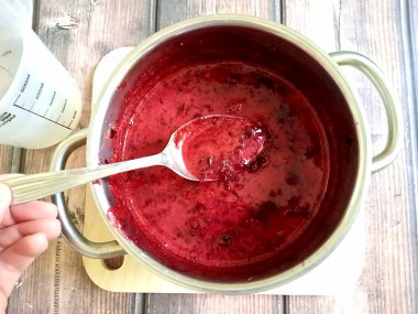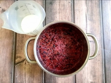 К ягодному пюре добавьте необходимое количество сахара. В зависимости от сладости ягод и вашего вкуса, количество сахара можно немного изменить в большую или меньшую сторону. Поставьте кастрюлю на умеренно сильный огонь и, при помешивании, доведите до кипения. Проварите ягоды в течении примерно минуты, выключите плиту. Снимите кастрюлю с плиты. Какую кастрюлю лучше выбрать читайте в статье по ссылке в конце рецепта.