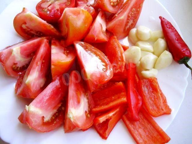 Томаты помойте, обсушите и нарежьте крупными кусочками, удаляя при этом твердую часть у плодоножки. Вы можете снять с них кожу, я оставила с ней. Как снять с помидоров кожицу? Сверху сделайте острым ножом надрезы крест-накрест. Опустите в кипяток на 1-2 минуты. Достаньте, слегка охладите и снимите кожицу. Перец болгарский помойте, отрежьте хвостик и удалите серединку с семенами. Нарежьте перец так же крупно, как и помидоры. Чеснок очистите.