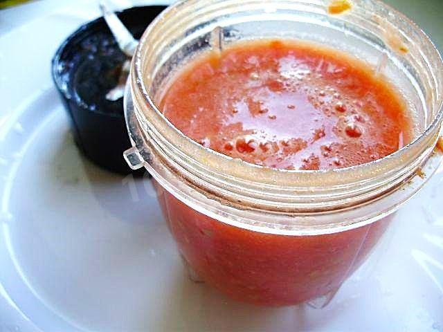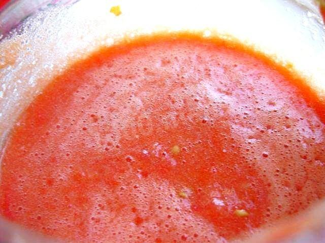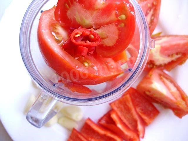 С помощью блендера по очереди измельчите помидоры и болгарский перец. Прокрутите их до получения кашицы. Так же можете воспользоваться мясорубкой или кухонным комбайном. Если у вас небольшая чаша измельчителя, то делайте это небольшими порциями.