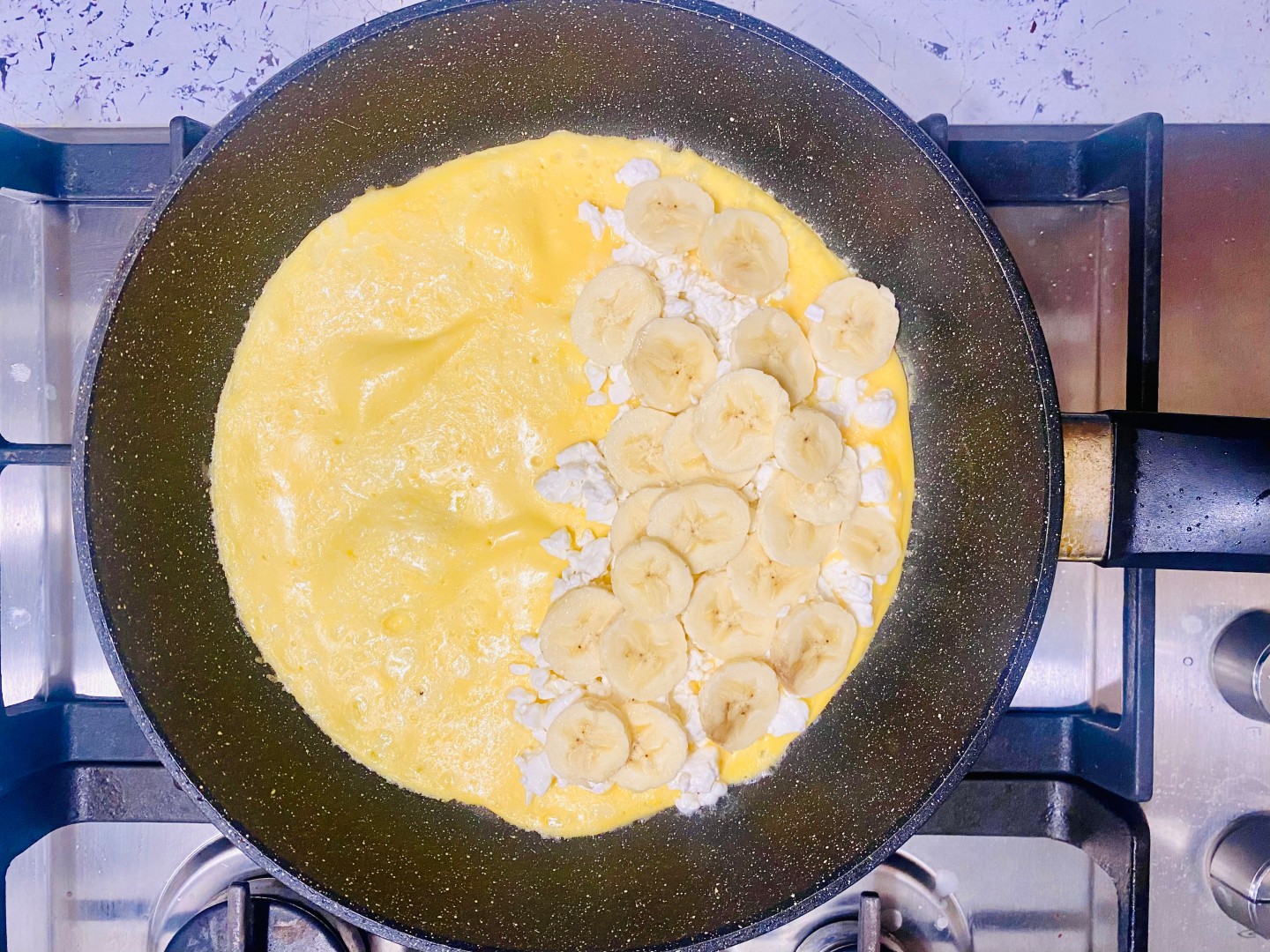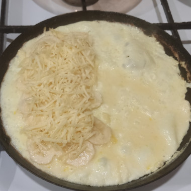 3. На половинку омлета добавьте нарезанный кружочками банан и натертый на терке сыр. Сыр хорошо брать нейтрального вкуса или сладковатый. Сложите омлет пополам и готовьте еще 5-7 минут под крышкой на небольшом огне. Если сильно поджаривается - переворачивайте с боку на бок.