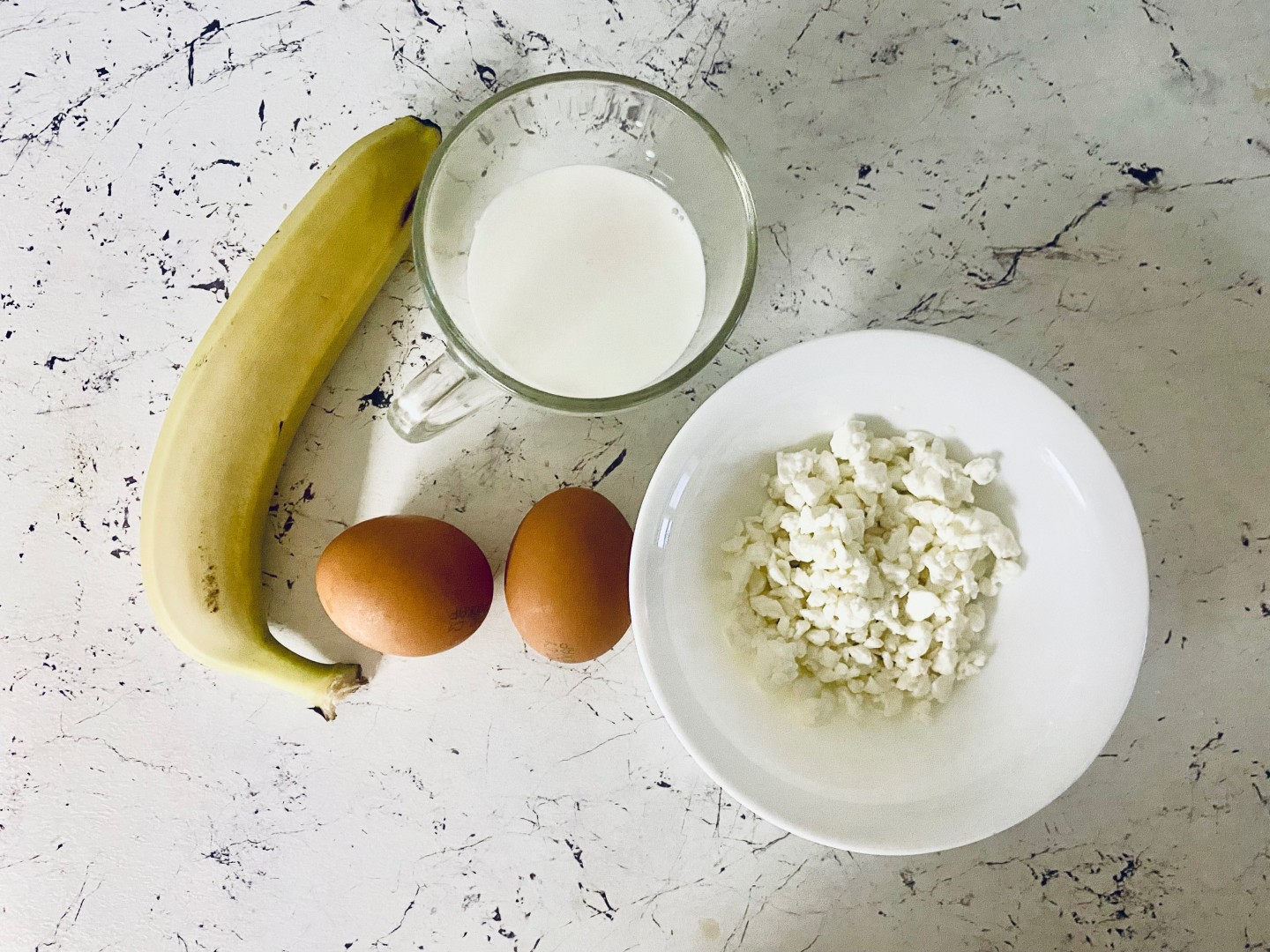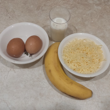 Банан порезала колечками, яйца слегка взбила с молоком, сыр натерла на тёрке. В сковороду вылила яйца с молоком, закрыла крышкой. Обжарила, затем на одну половину выложила колечки банана, тёртый сыр. Накрыла второй половиной яичного блина и обжарила.