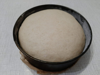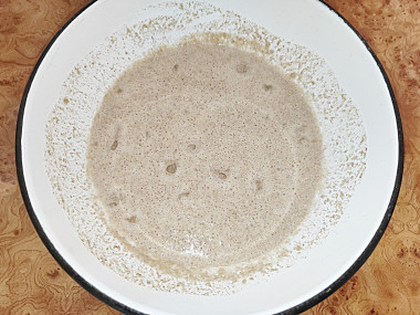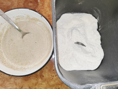 Я приготовила опару на ночь из 50 грамм готовой пшеничной закваски, 35 грамм ржаной муки и полного объёма сыворотки.