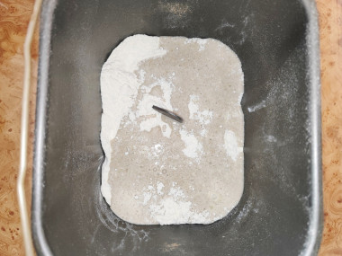 В чашу хлебопечки добавьте: дрожжи, пшеничную и ржаную муку, соль. Влейте оливковое масло и сыворотку. Важно соблюдать именно такой порядок закладки ингредиентов. Включите основной режим (для выпечки обычного хлеба). В каждой хлебопечке эта программа занимает разное время, в моей процесс длится 3,5 часа.