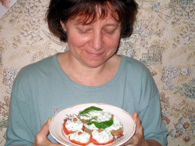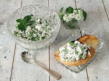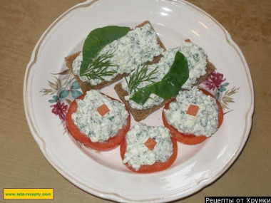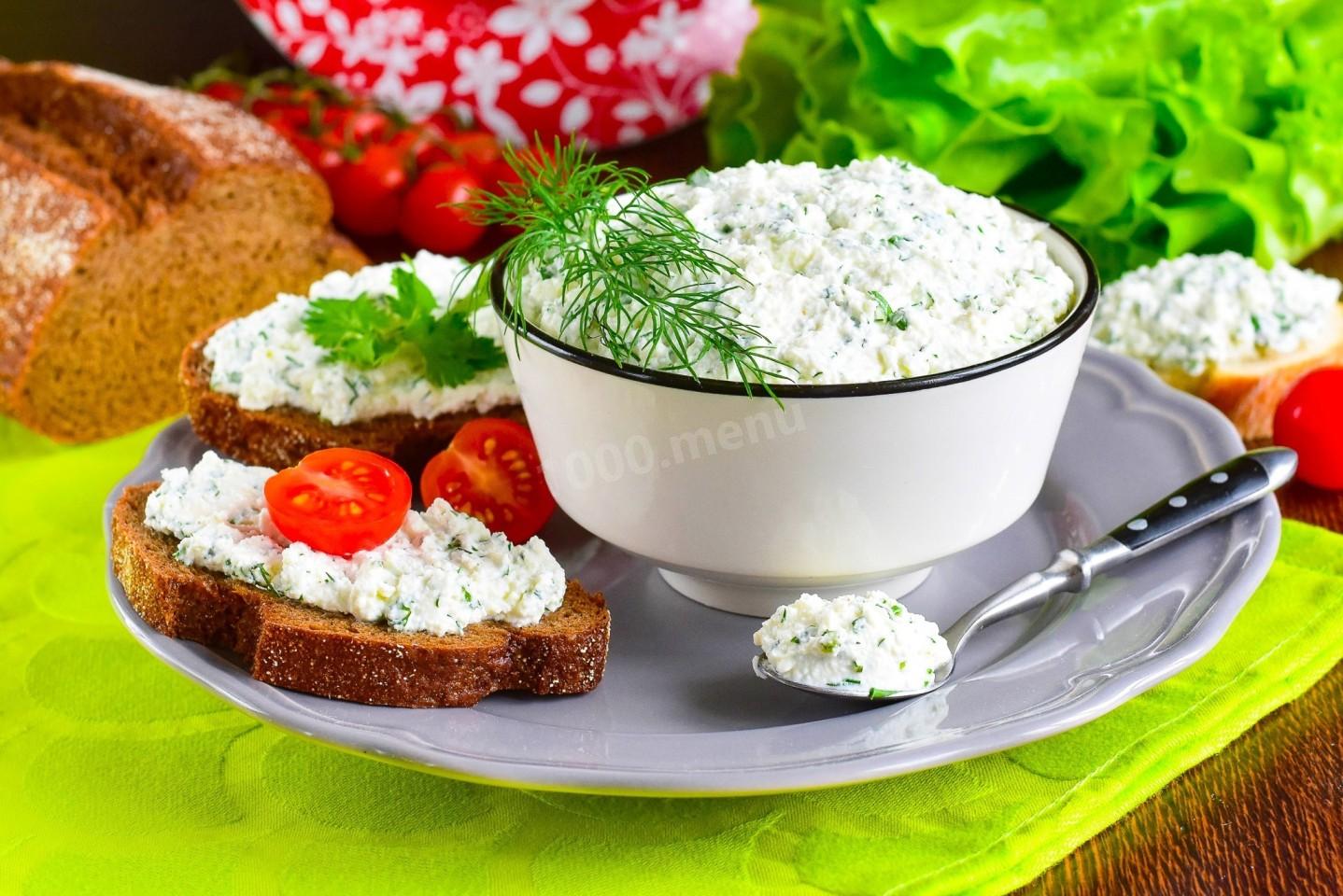 Творожная намазка с укропом и зеленью для бутербродов готова. Можно намазать её на куски хлеба или кружочки помидоров. Приятного аппетита!