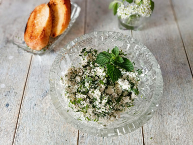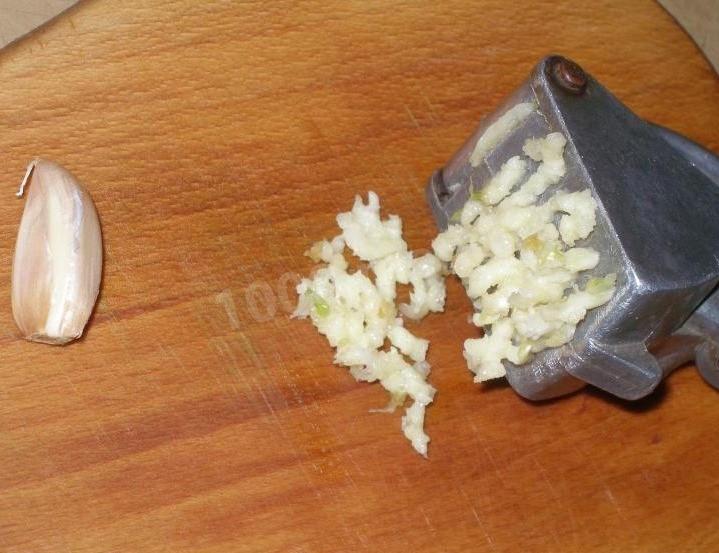 Чеснок очистите от шелухи и пропустите через пресс. Его количество можно регулировать по вкусу. Отправьте измельченный чеснок к творогу с зеленью. Добавьте соль и перец по вкусу.