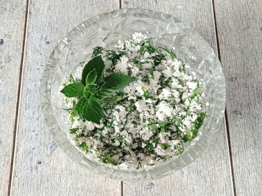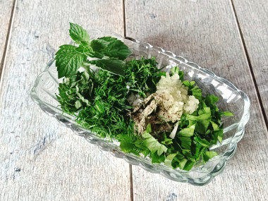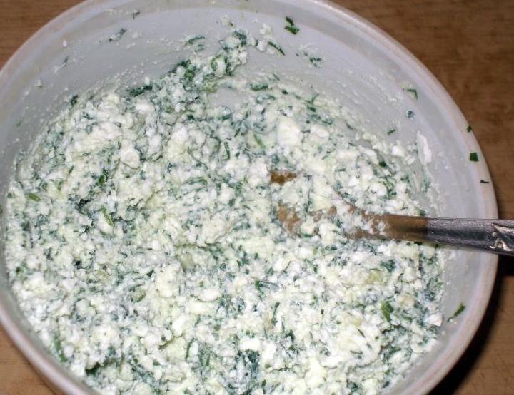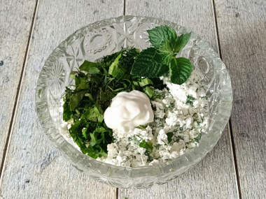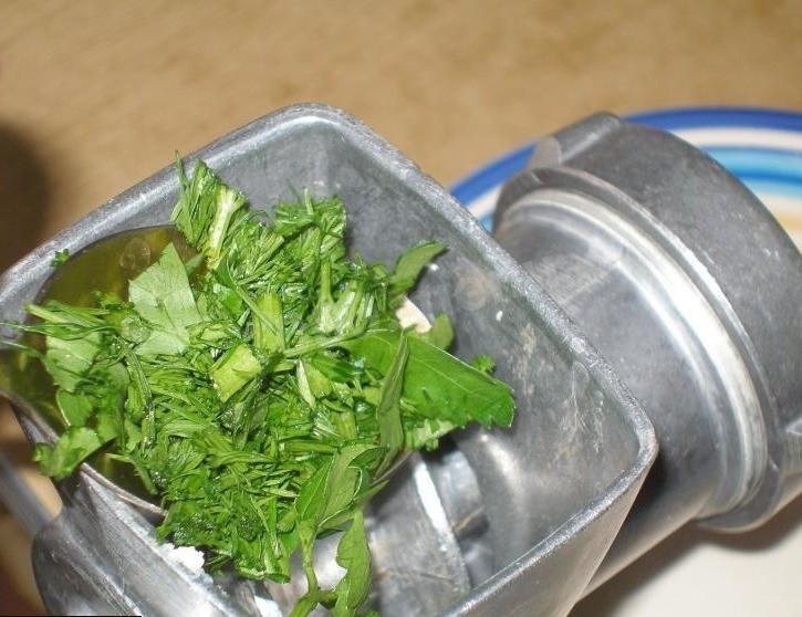 Также пропустите через мясорубку (или измельчите в блендере,кухонного комбайне) зелень. Я взяла укроп, зеленую кинзу, петрушку и мяту. Вы можете использовать любую другую зелень по вкусу. Однако я советую всё-таки добавить укроп, поскольку он отлично сочетается с творогом.